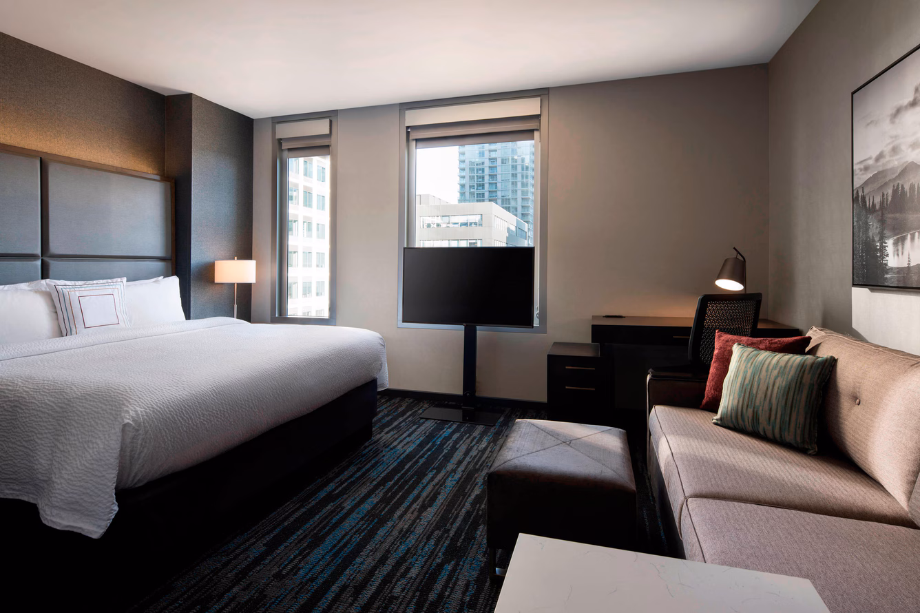 The Residence Inn by Marriott Seattle Downtown/Convention Center is a suitable choice for guests traveling with pets thanks to its pet-friendly policies, on-site relief area, and proximity to multiple parks. Several pet-friendly nature areas are within easy reach, including off-leash dog parks such as Rufus Dog Park, Regrade Park, and Denny Park Off-Leash Area, along with leashed-walking options like Olympic Sculpture Park and Myrtle Edwards Park. The hotel supports pet comfort by offering a welcome bag with treats and toys at check-in, a small designated outdoor relief area with a waste station on-site, and spacious all-suite accommodations with fully equipped kitchens, providing added convenience and space for pets. Its central downtown location near the Seattle Convention Center further enhances walkability and access to pet-friendly areas.