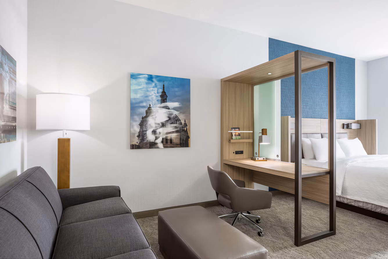 $119 to $415 /nightSpringHill Suites St. Paul Downtown is pet friendly because it offers a smart blend of space, location, and flexibility for guests traveling with pets. The downtown setting provides easy access to sidewalks and riverfront routes, making short walks and outdoor breaks simple to manage. Guests can take pets to nearby pet-friendly spots such as Rice Park, Mears Park, and the Mississippi River trails, which offer a mix of greenery and scenic city views. Inside, the hotel’s open-concept suites, relaxed atmosphere, and accommodating pet policy give pets room to settle in comfortably while guests enjoy a modern, stress-free stay.